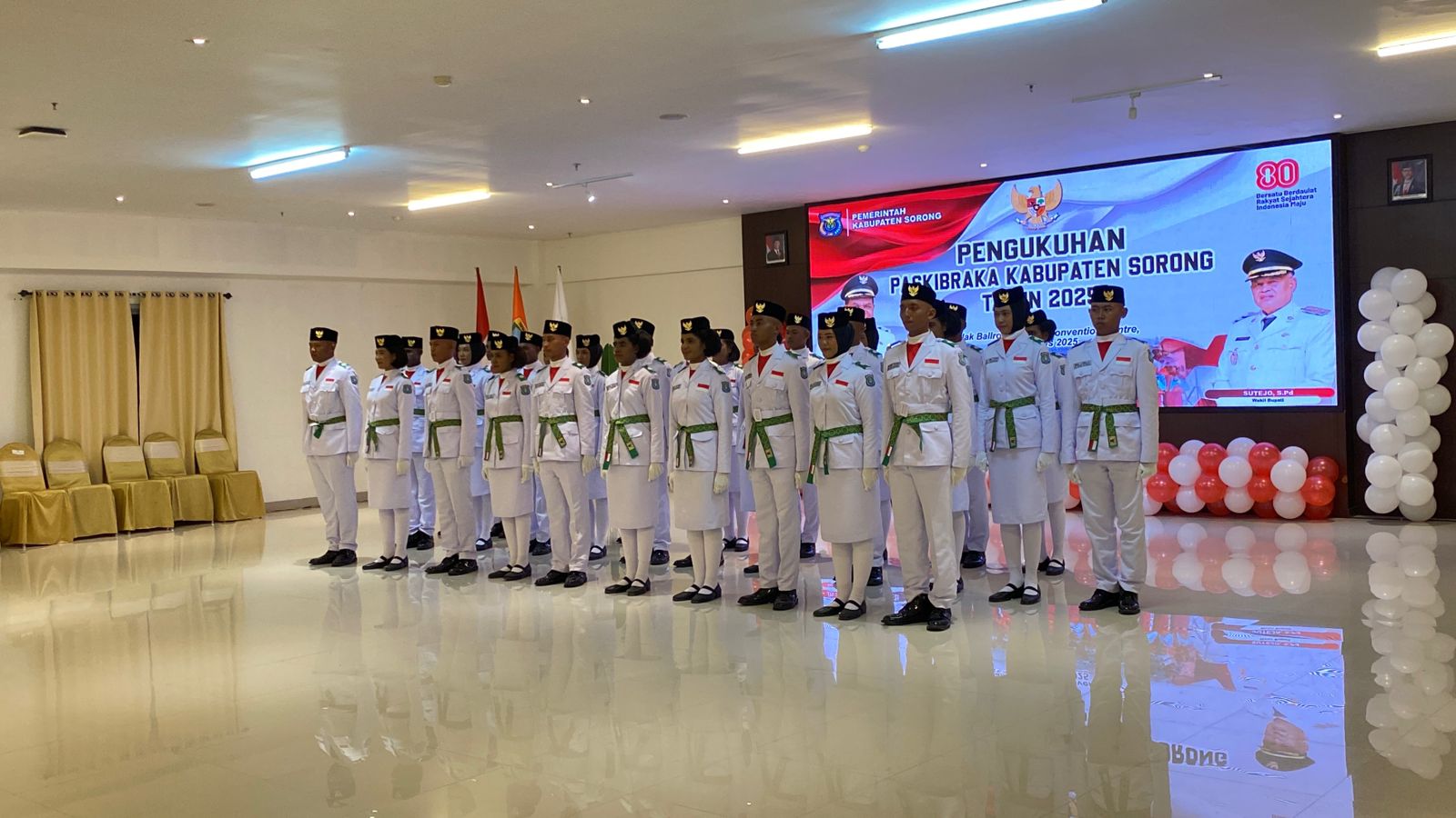 SORONG- Bupati Sorong, Johny Kamuru, mengukuhkan 30 anggota Pasukan Pengibar Bendera Pusaka (Paskibraka) Kabupaten Sorong Tahun 2025 dalam upacara resmi di Aimas Hotel, Jumat malam, 15 Agustus 2025.