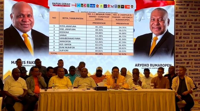 JAYAPURA – Partai Golkar mengklaim kemenangan pasangan calon Gubernur dan Wakil Gubernur Papua nomor urut 02 Mathius Fakhiri – Aryoko Rumaropen (Mari-Yo) dalam Pemungutan Suara Ulang (PSU), Pemilihan Gubernur Provinsi Papua 2024 berdasarkan hasil exit poll sementara yang mereka himpun secara real-time hingga ke tingkat Tempat Pemungutan Suara (TPS).