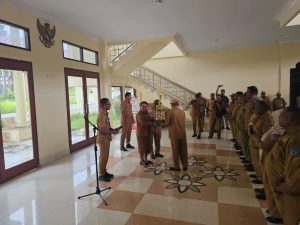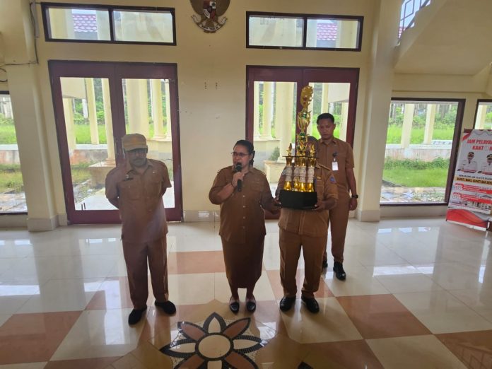 Prosesi penerimaan piala ini diserahkan secara langsung oleh Asisten 2 Setda Sorong Selatan Yohan Hendrik Kokurule bersama 12 OPD yang menangani akai konvergensi, saat apel, Senin (25/08/2025) bertempat di lobi Kantor Bupati Sorong Selatan.