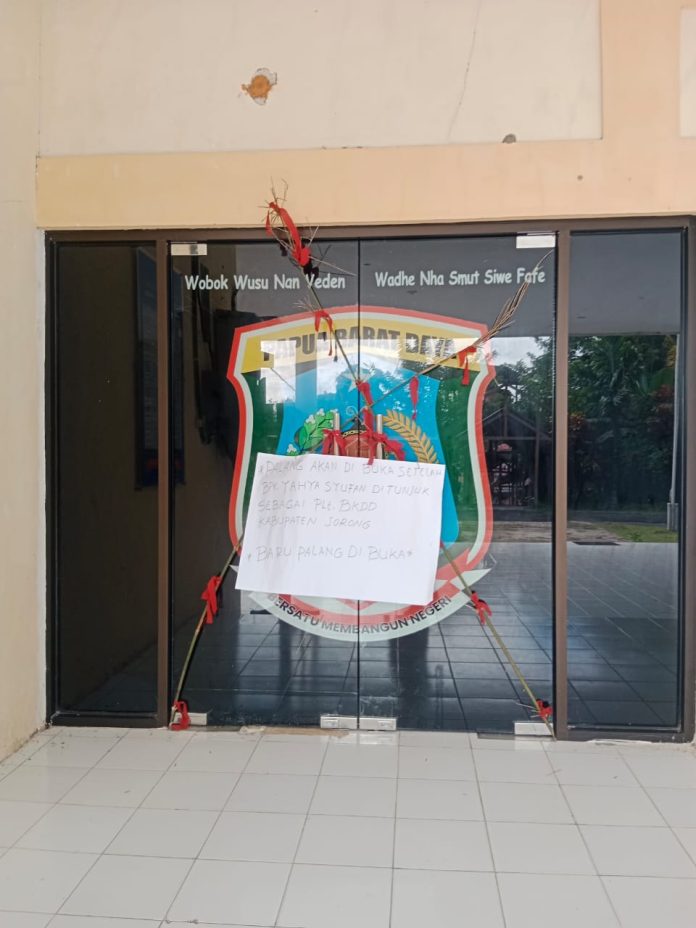 SORONG – Sebatang bambu dan sehelai kain merah, menutupi pintu kantor Badan Kepegawaian dan Diklat Daerah (BKDD) Kabupaten Sorong, di Jalan Sorong-Klamono, Distrik Aimas.