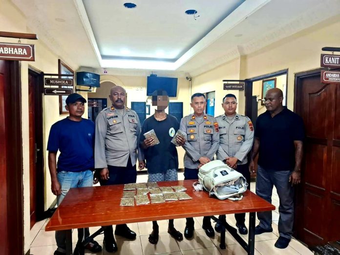 JAYAPURA – Personel Kepolisian Sektor Kawasan Pelabuhan Laut (Polsek KPL) Jayapura berhasil mengamankan seorang pria berinisial M (20) yang membawa Narkotika jenis ganja saat hendak naik ke kapal KM – Ciremai di Dermaga – I Pelabuhan Laut Jayapura, Papua.