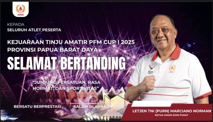 JAKARTA – Ketua Umum Komite Olahraga Nasional Indonesia (KONI) Pusat Letjen TNI (Purn) Marciano Norman menyampaikan apresiasi atas penyelenggaraan Kejuaraan Tinju Amatir PFM Cup I di Kota Sorong, Papua Barat Daya.