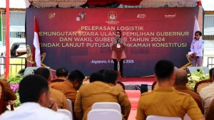 Seremoni pelepasan logistik dihadiri langsung Wakil Menteri Dalam Negeri Dr. Ribka Haluk, S.Sos., MM., Anggota KPU – RI Iffa Rosita, SE., MM., Pj. Gubernur Papua Dr. Agus Fatoni serta unsur Forkopimda Papua maupun Kota Jayapura dan dipimpin oleh Ketua KPU Provinsi Papua, Diana Dorthea Simbiak, S.Sos.