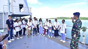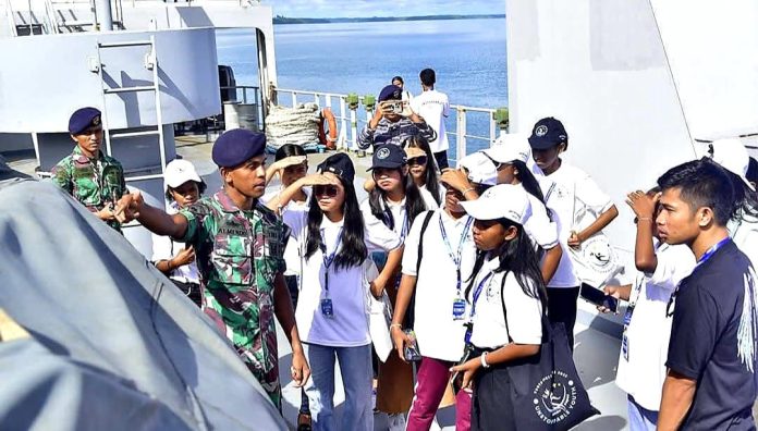 Mereka juga mendapat pengarahan langsung dari para perwira dan personel KRI Teluk Weda-526 tentang fungsi strategis kapal dalam mendukung pertahanan maritim Nasional.