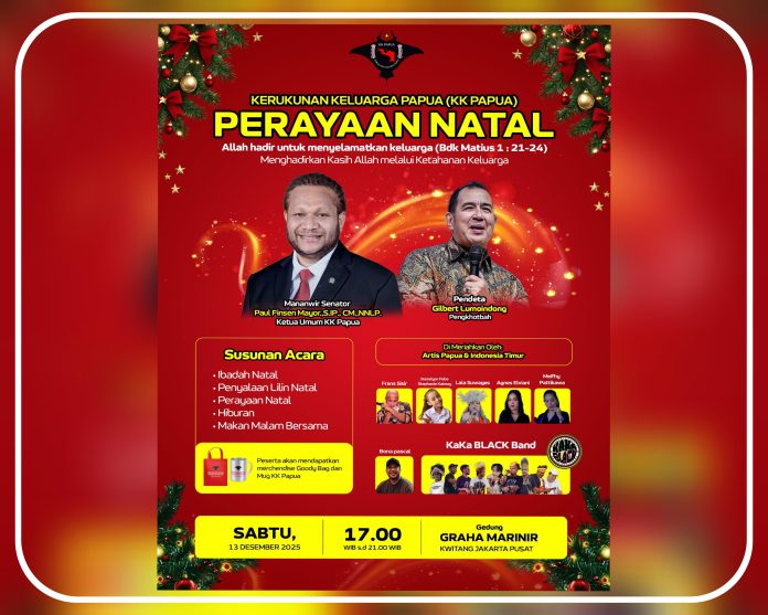 JAKARTA – Kerukunan Keluarga Papua (KK PAPUA) akan merayakan Natal secara nasional di Gedung Graha Marinir, Kwitang, Jakarta Pusat pada Sabtu (13/12/2025). Peringatan Natal Perdana sejak KK PAPUA dibentuk pada Oktober lalu, rencananya dihadiri 1000-an warga Papua dari DKI Jakarta, Banten dan Jawa Barat.