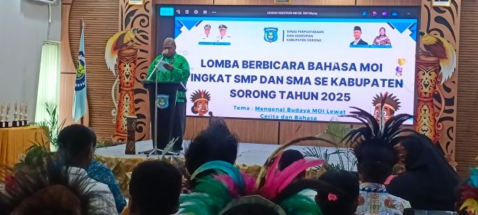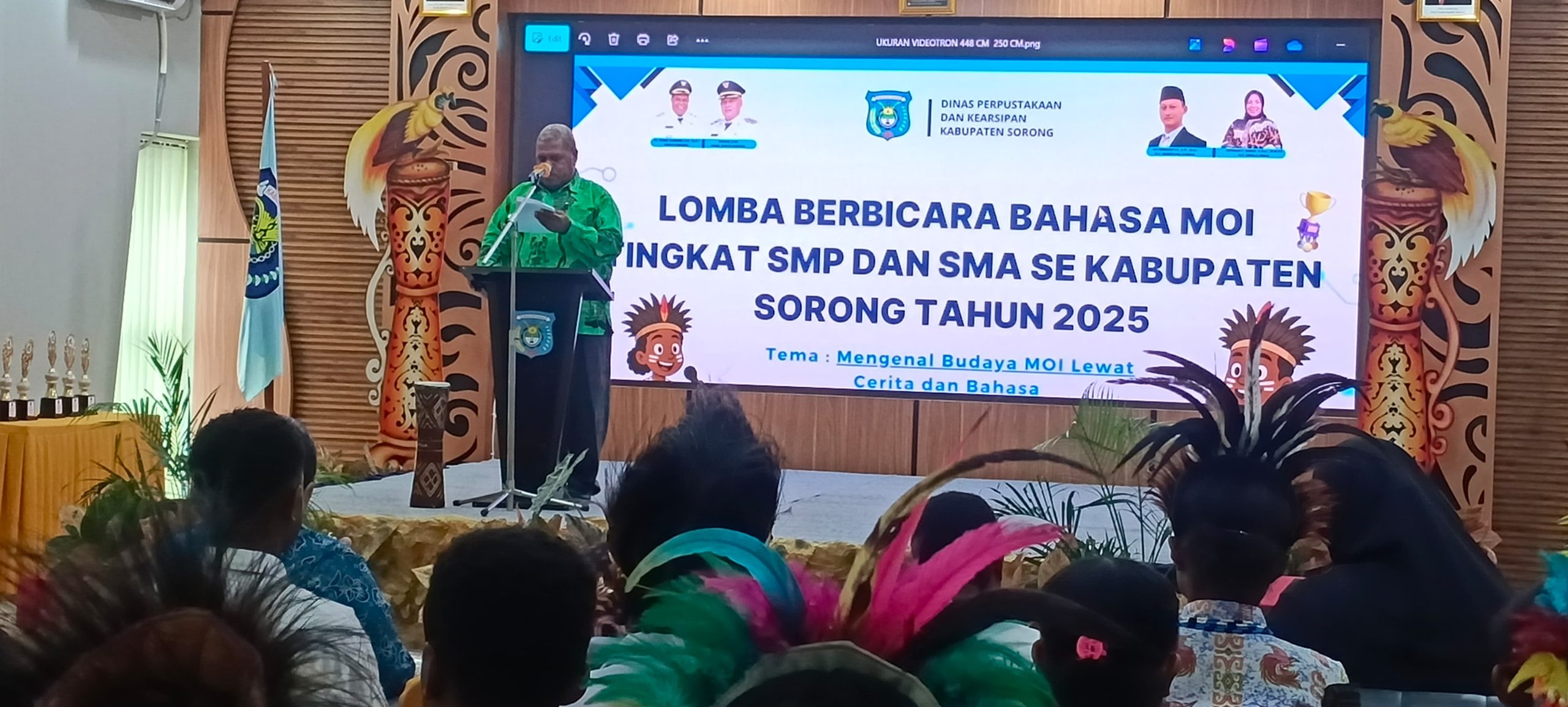 SORONG- Dalam rangka memperingati pengukuhan Bunda Literasi Kabupaten Sorong masa bakti 2025–2030, Dinas Perpustakaan dan Kearsipan Kabupaten Sorong menggelar Lomba Berbicara Bahasa Moi tingkat SMP dan SMA se-Kabupaten Sorong, Kamis (24/07/25). Kegiatan bertema “Mengenal Budaya Moi Lewat Cerita dan Bicara” ini bertujuan memperkuat identitas budaya lokal di tengah ancaman kepunahan bahasa daerah.
