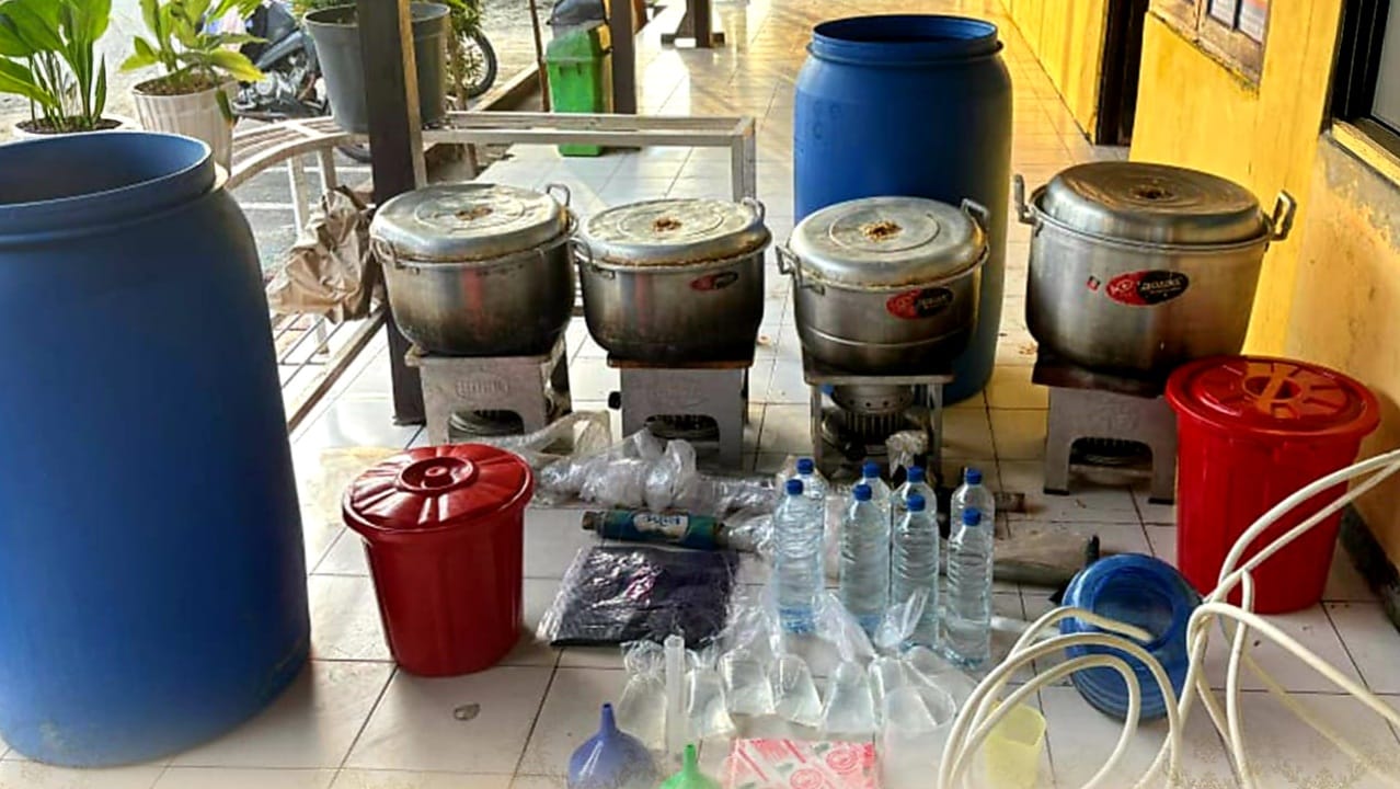 Dari penggerebekan tersebut, petugas mengamankan tiga orang tersangka berinisial “LSL” (22), “LOP” (25) dan “NM” (29) beserta sejumlah barang bukti peralatan penyulingan tradisional.