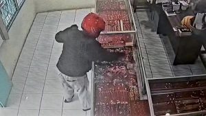 Dari rekaman CCTV, pelaku yang datang tiba-tiba masuk ke toko emas dan langsung memecahkan kaca etalase lalu mengambil emas seberat satu talang.