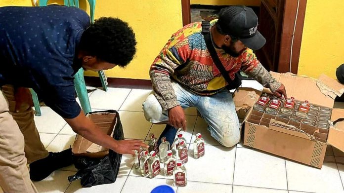Dari hasil penggeledahan, aparat juga menemukan dan mengamankan 44 botol miras jenis Vodka Robinson dari beberapa wisma di kawasan Maruni.