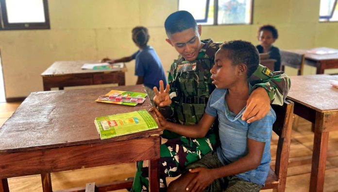 HomeBerita PapuaTNI Bangkitkan Semangat Belajar Anak-Anak Mofinop, Teguhkan Cinta Tanah Air di Perbatasan