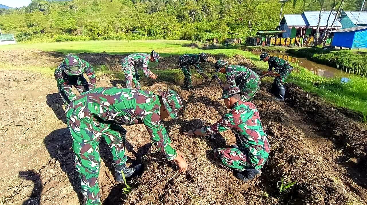 Bersama warga Kampung Bomomani, Distrik Mapia, para prajurit TNI -AD membuka lahan tidur, mengolah tanah dan menanam komoditas lokal seperti ubi, jagung dan sayur-mayur.
