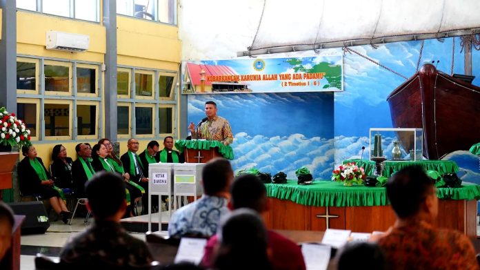 Ibadah yang dipimpin Pendeta Panggabean, S.Th, berlangsung khidmat dan penuh keakraban, diiringi lantunan lagu-lagu pujian Gerejawi.